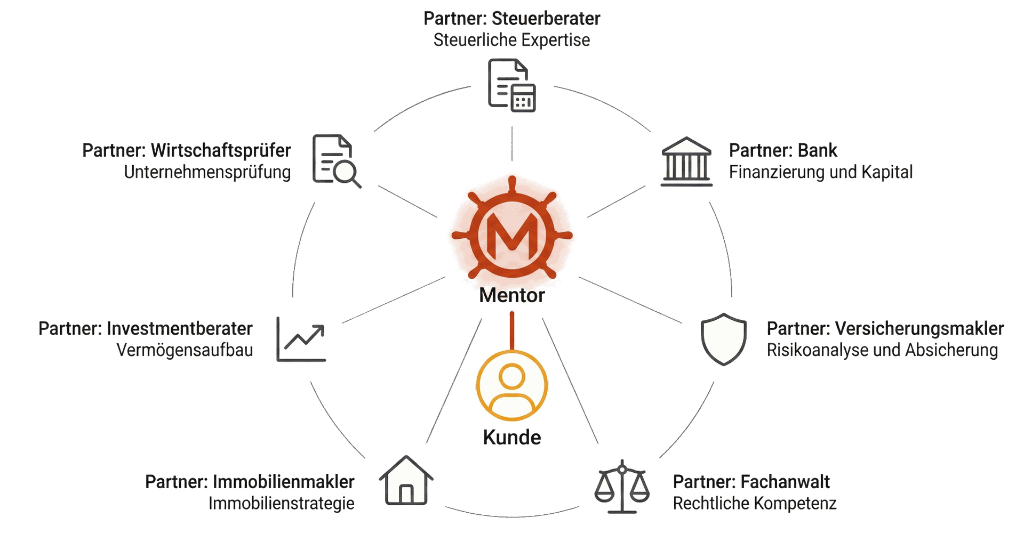 Unternehmerische Entscheidungen werden leichter, wenn alle Fäden an einer Stelle zusammenlaufen. Als zentraler Mentor koordinieren wir ein Netzwerk aus spezialisierten Partnern und verbinden steuerliche, finanzielle und rechtliche Kompetenz zu einem klaren Gesamtkonzept. Für Sie bedeutet das: weniger Komplexität, kürzere Wege und Lösungen, die fachlich und strategisch aufeinander abgestimmt sind.
