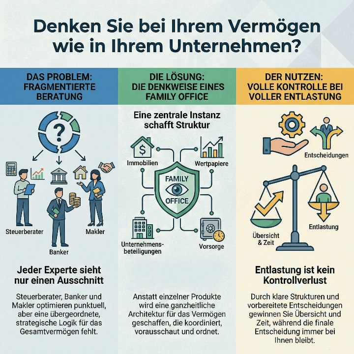 In der Praxis sehen wir immer wieder das gleiche Bild. Das Unternehmen läuft gut. Gewinne entstehen. Entscheidungen zum Vermögen werden jedoch fragmentiert getroffen. Jeder Berater betrachtet seinen Ausschnitt, aber niemand das Ganze.